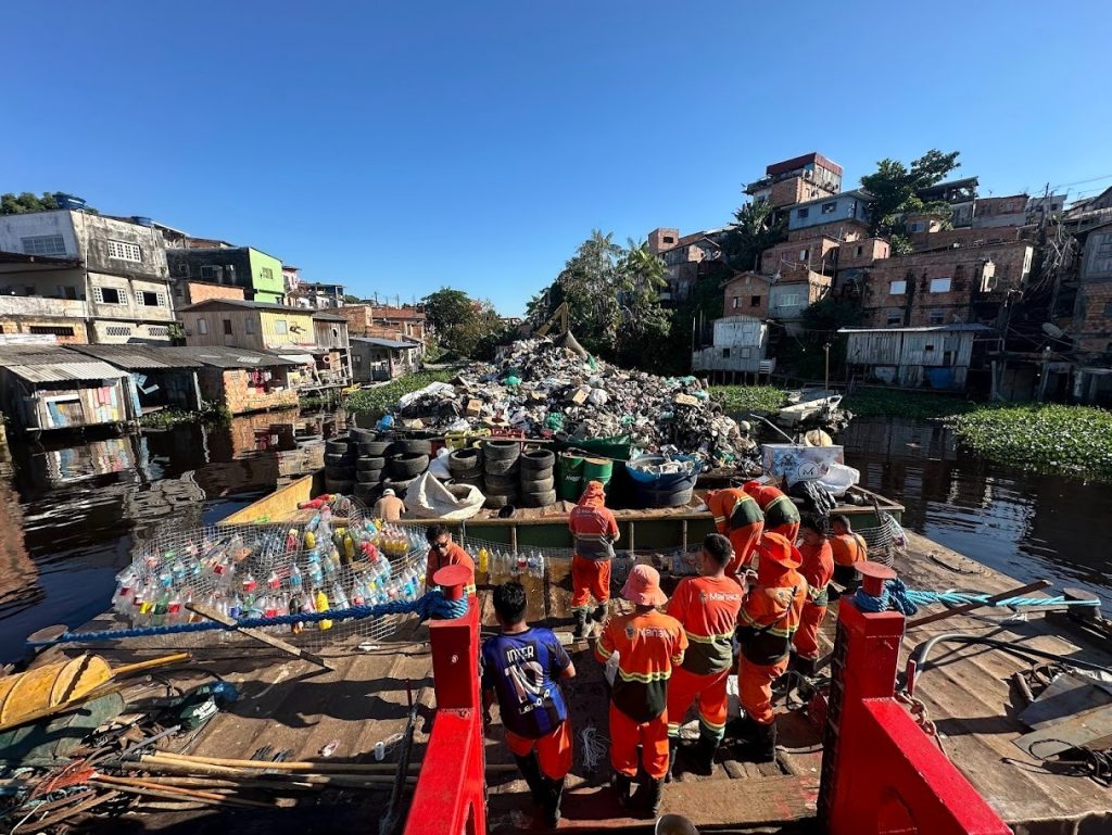 Prefeitura intensifica limpeza da orla de Manaus e prepara transbordo de balsas com lixo retirado dos igarapés