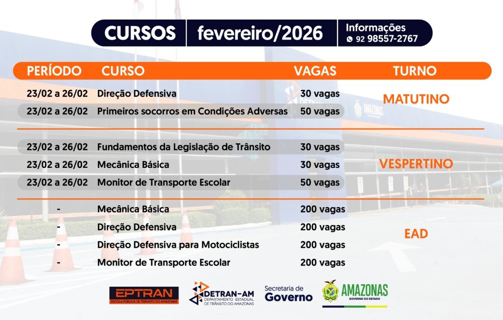 As inscrições já estão abertas para as aulas nos turnos matutino e vespertino, além de cursos online Por meio da Escola Pública de Trânsito (Eptran), o Detran-AM abre inscrições para os cursos gratuitos que serão promovidos ao longo do mês de fevereiro. No total, são 990 vagas disponíveis, com turmas nos turnos da manhã e […]
