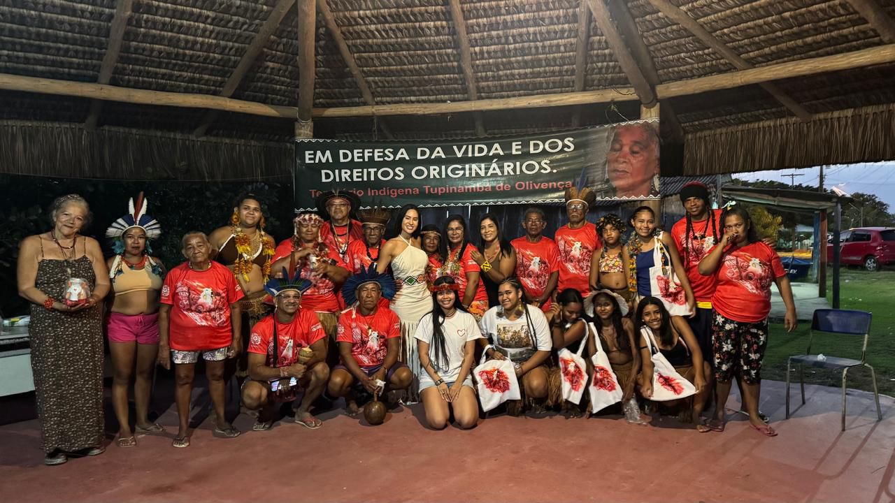 Em um gesto de diálogo, escuta e reconexão ancestral, o Boi-Bumbá Garantido realizou, entre os dias 30 de maio e 1º de junho, uma visita ao território Tupinambá de Olivença, localizado em Ilhéus (BA). Representado por Izabel Munduruku, integrante da Comissão de Artes, e Isabelle Nogueira, cunhã-poranga, o Boi Garantido participou de uma agenda de consulta livre com caciques, anciãos, lideranças e membros do povo Tupinambá de Olivença.