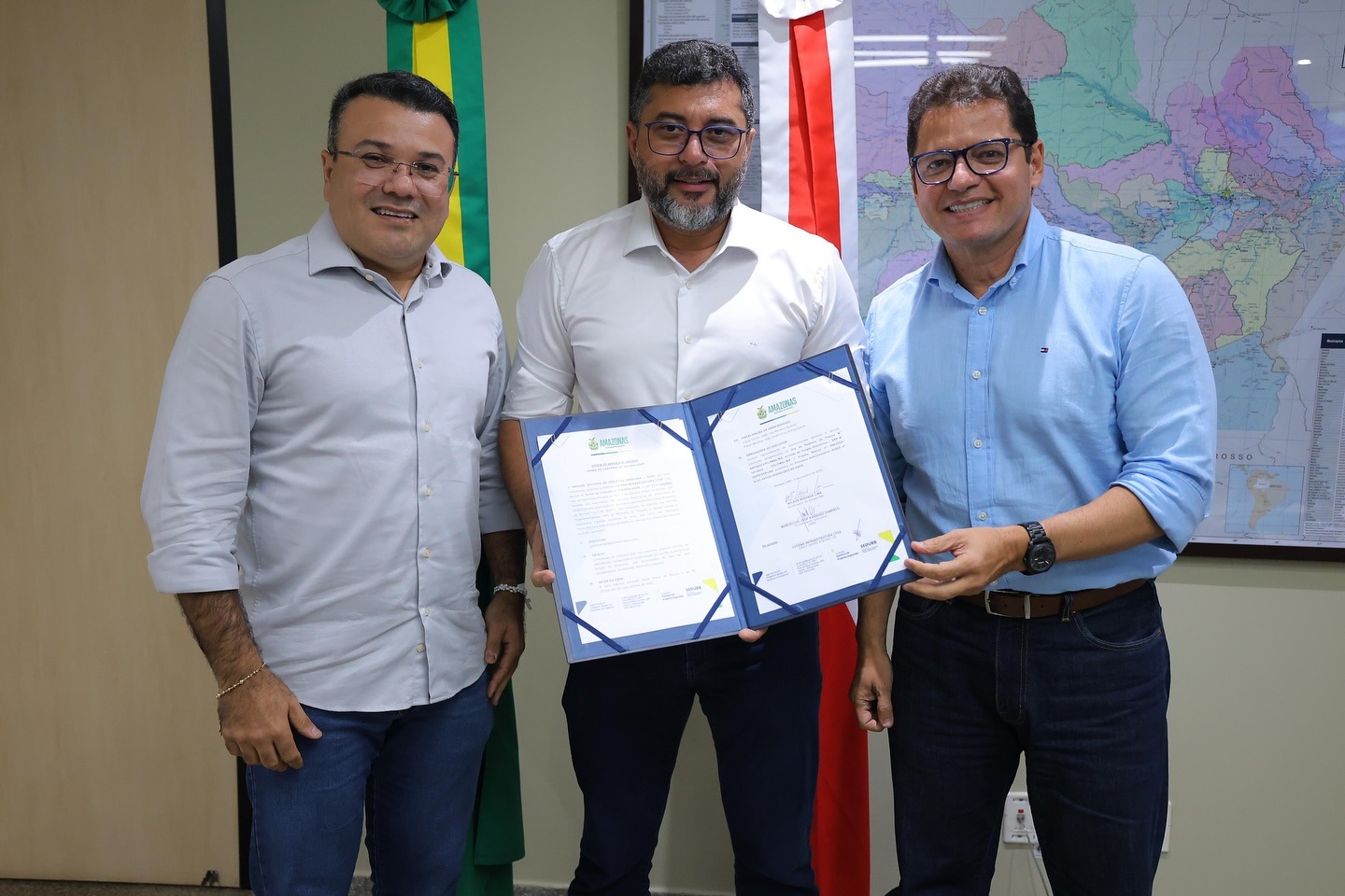 Prefeito Darlan Taveira, ao lado do governador Wilson Lima e do secretário Marcellus Campêlo, anuncia início de nova fase de infraestrutura viária no município
