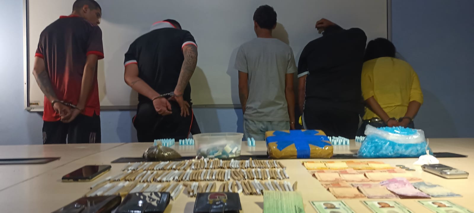 A equipe se deslocou até o local e confirmou o fato e prendeu o grupo em flagrante. Durante a ação, foram apreendidos 1 kg de cocaína, vários pinos de cocaína, uma quantia em dinheiro e diversos cigarros de maconha.
