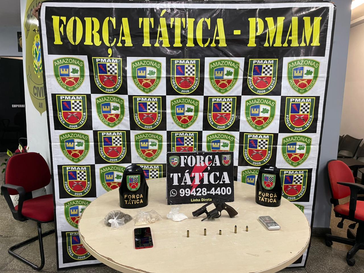 Durante a ação, foram apreendidos uma arma, munições, um aparelho celular e drogas. O caso foi registrado no 14° Distrito Integrado de Polícia para os procedimentos cabíveis.