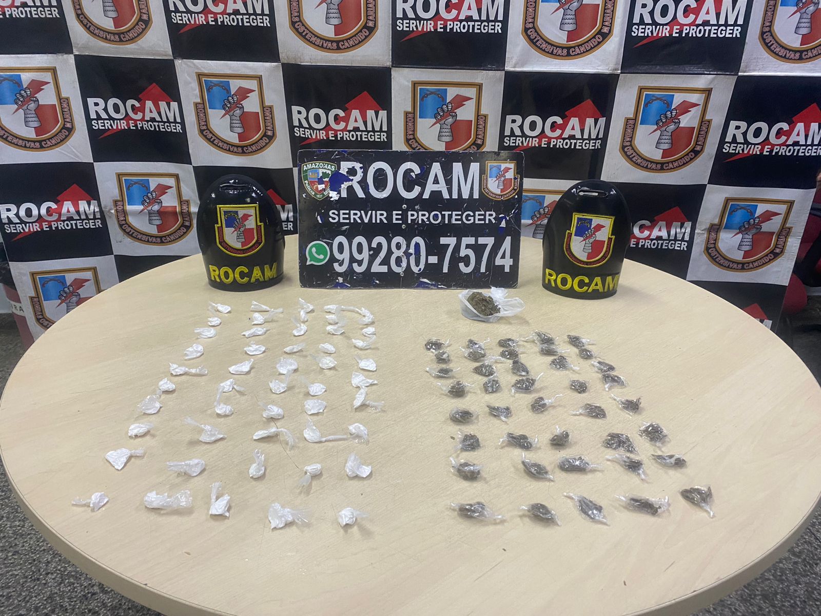 Durante a ação, foram apreendidas porções de maconha e cocaína, além disso, um celular utilizado no crime também foi apreendido.