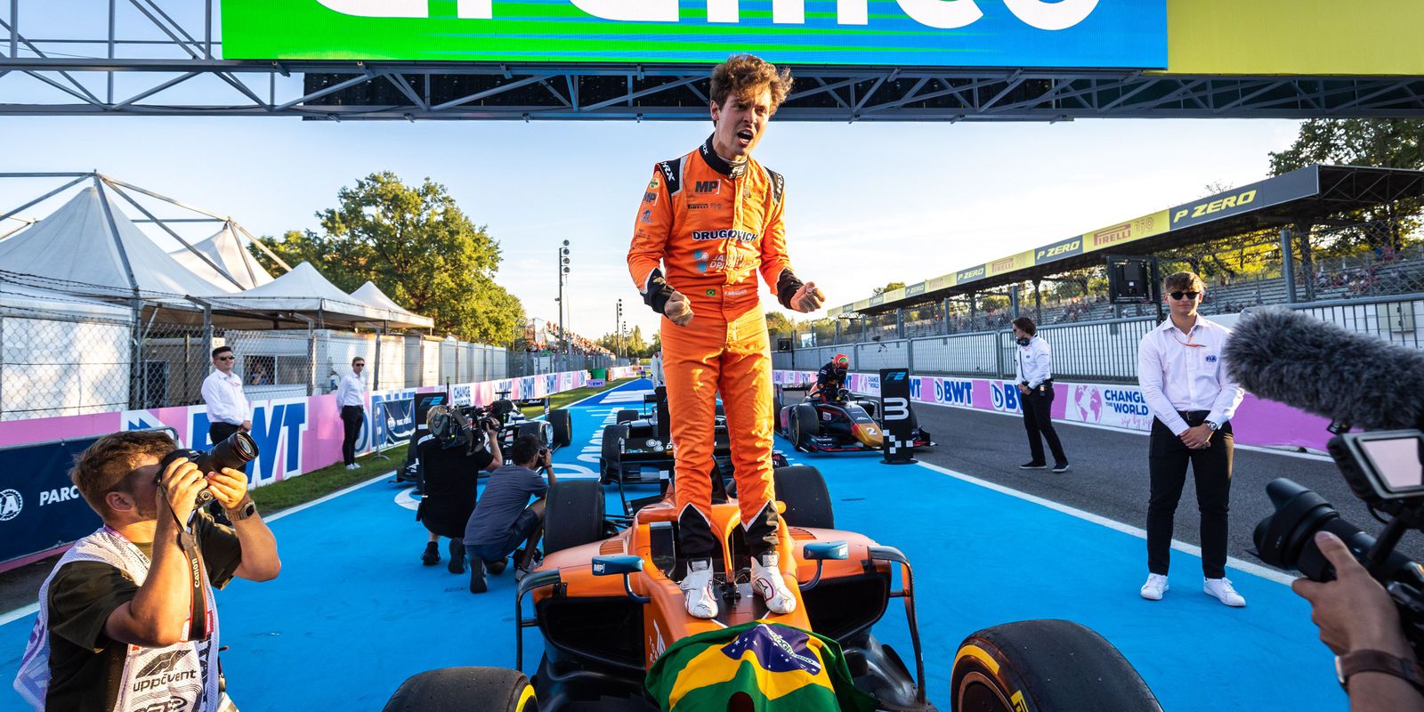 O piloto paranaense Felipe Drugovich confirmou a conquista do título mundial de Fórmula 2 neste sábado (10). O palco foi o Autódromo de Monza, na Itália. Guiando um carro da equipe holandesa MP Motorsport, ele se tornou o primeiro brasileiro campeão da história da Fórmula 2, a última categoria antes da Fórmula 1.