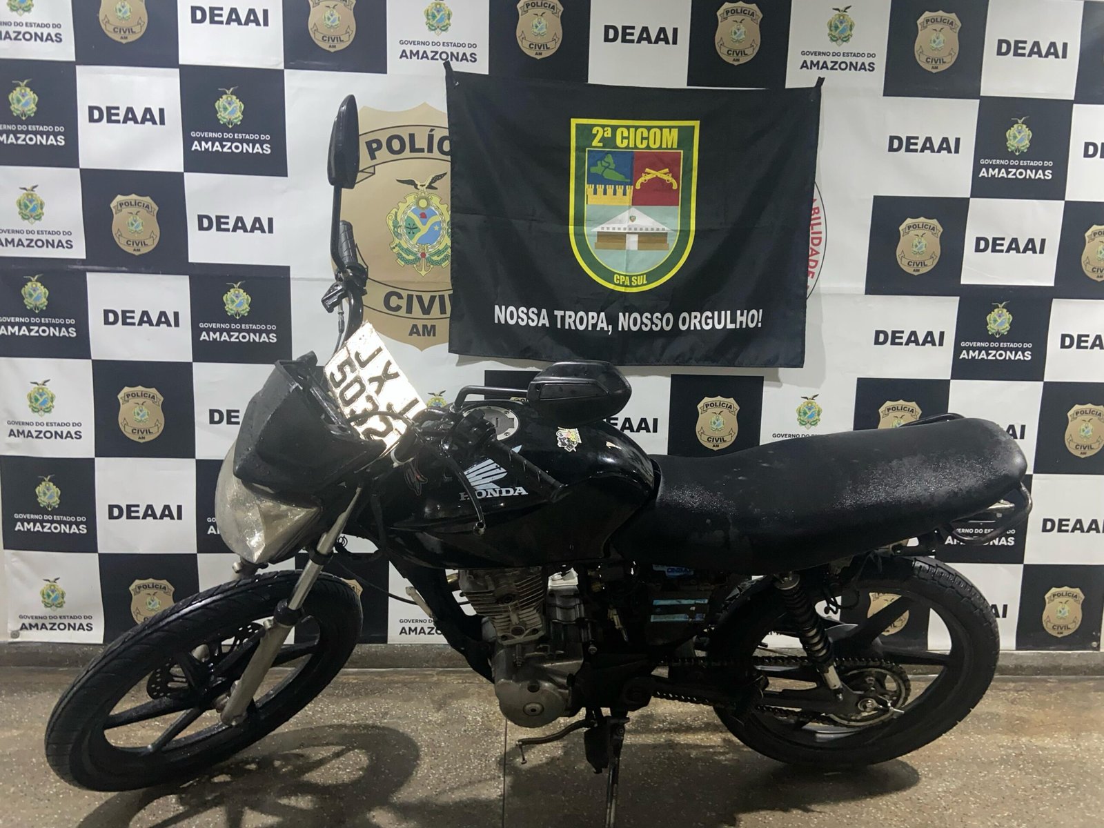 A Polícia Militar do Amazonas, por meio da 2ª Companhia Interativa Comunitária (Cicom), apreendeu um adolescente, de 17 anos, que estava em posse um motocicleta com restrição, sem placa e com as características de fábrica adulteradas. O fato ocorreu na noite de sexta-feira (07/03), no bairro Educandos, zona sul de Manaus.