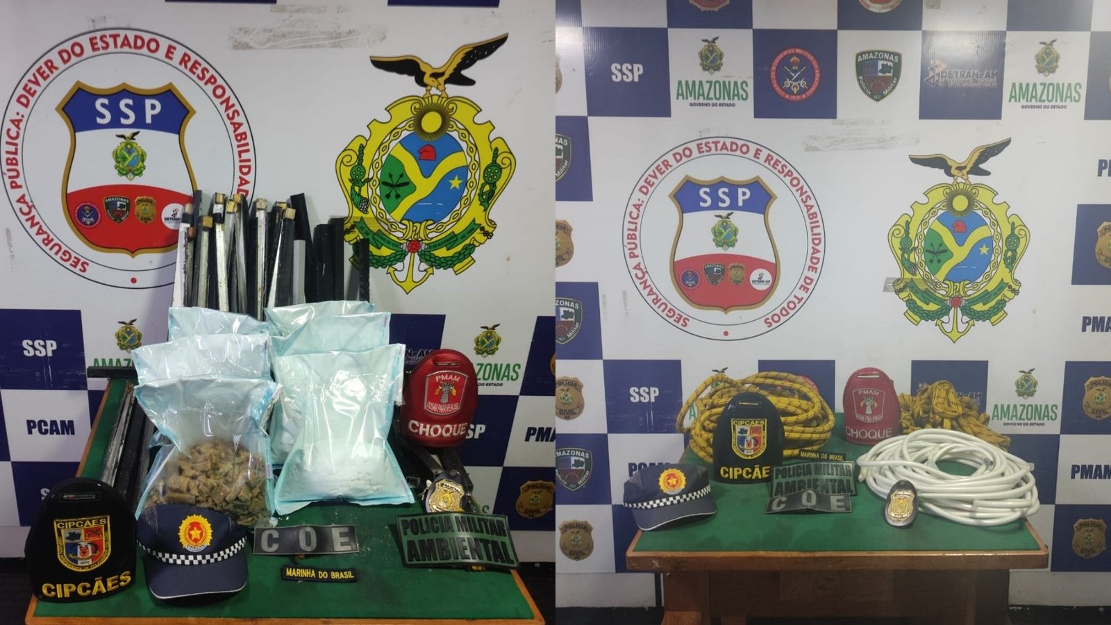 Cerca de 12 quilos de entorpecentes camuflados em rolos de corda e em pedaços de ferro foram apreendidos, na madrugada desta terça-feira (02/07). As drogas foram localizadas pelas equipes da Secretaria de Estado de Segurança Pública (SSP-AM) em conjunto com as Polícias Militar (PMAM), Civil (PC-AM) em operação na Base Fluvial Arpão 1, durante abordagem a uma embarcação, nas proximidades de Coari (a 363 quilômetros de Manaus). Ainda na ação, duas pessoas foram presas por tráfico de drogas.
