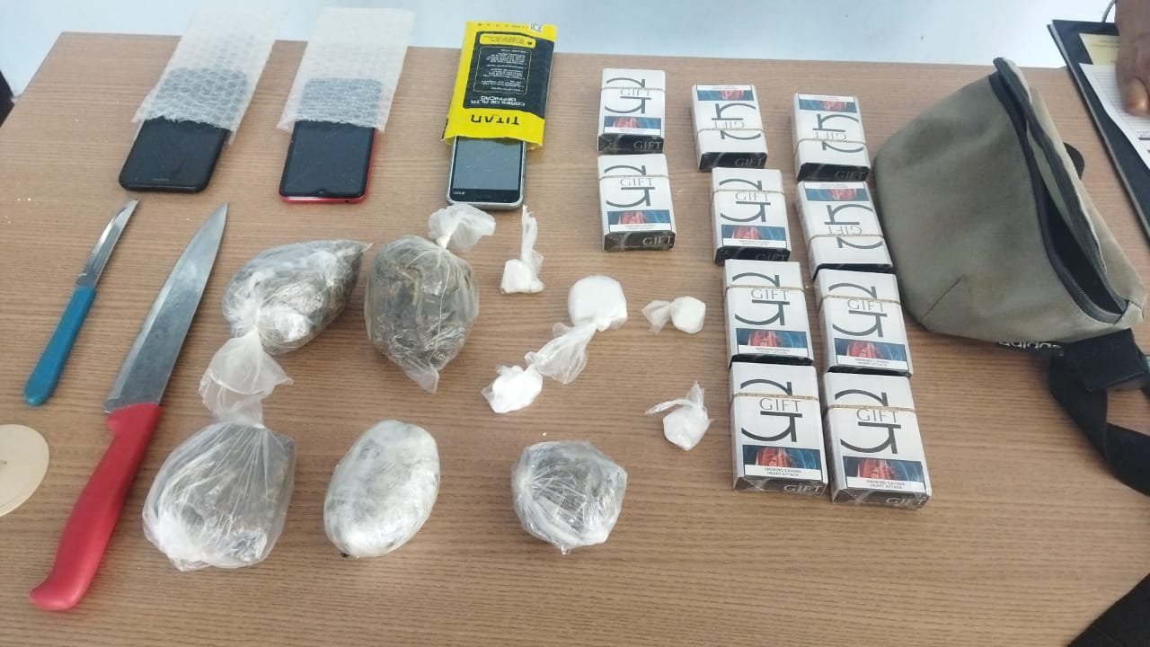 Foram apreendidas dez carteiras de cigarro, cinco porções de cocaína, cinco porções de maconha, três aparelhos celulares e duas facas, que foram encaminhadas, juntamente com o suspeito, para a Delegacia Interativa de Polícia (DIP) de Parintins.