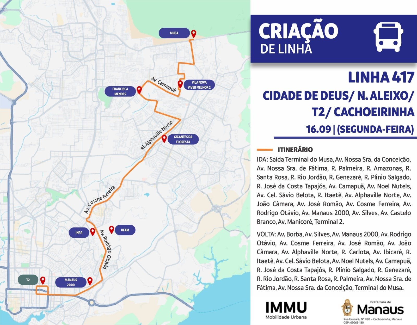 A Prefeitura de Manaus, por meio do Instituto Municipal de Mobilidade Urbana (IMMU), implementa, a partir da próxima segunda-feira, 16/9, a nova linha 417, que ligará a zona Leste à zona Sul da cidade. A nova rota atenderá os moradores dos bairros Cidade de Deus, Nossa Senhora de Fátima, Nossa Senhora da Conceição e Viver Melhor 2, e seguirá em direção ao Terminal da Cachoeira (T2), no bairro Cachoeirinha.