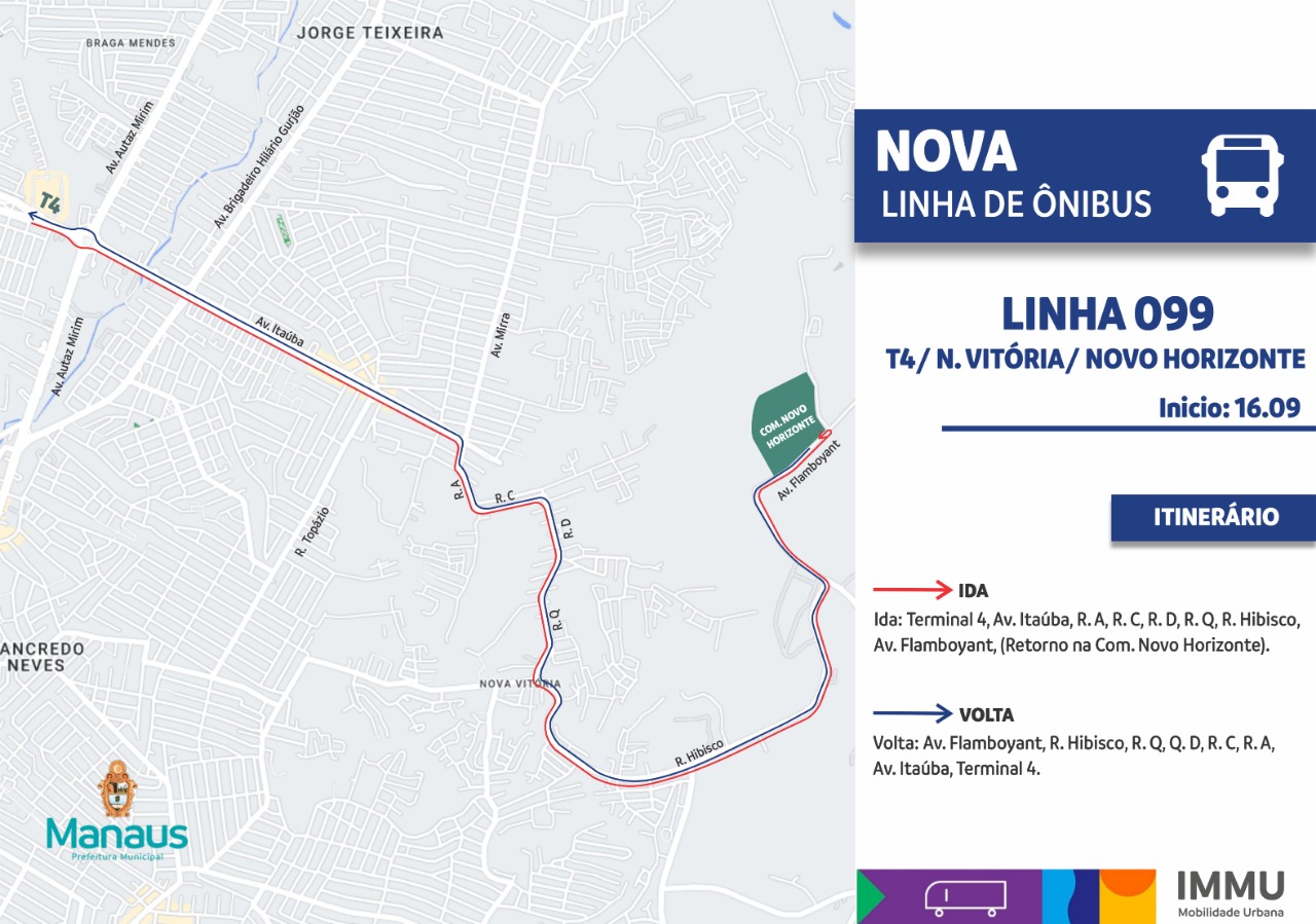 A linha 099 partirá do Terminal de Integração 4 (T4), no bairro Cidade Nova, zona Norte, no sentido Terminal/bairro, seguirá pela avenida Itaúba, depois vai acessar as vias por dentro do bairro Nova Vitória, seguindo pelas ruas A, C, D, Q e Hibisco e finaliza na avenida Flamboyant, na comunidade Novo Horizonte.