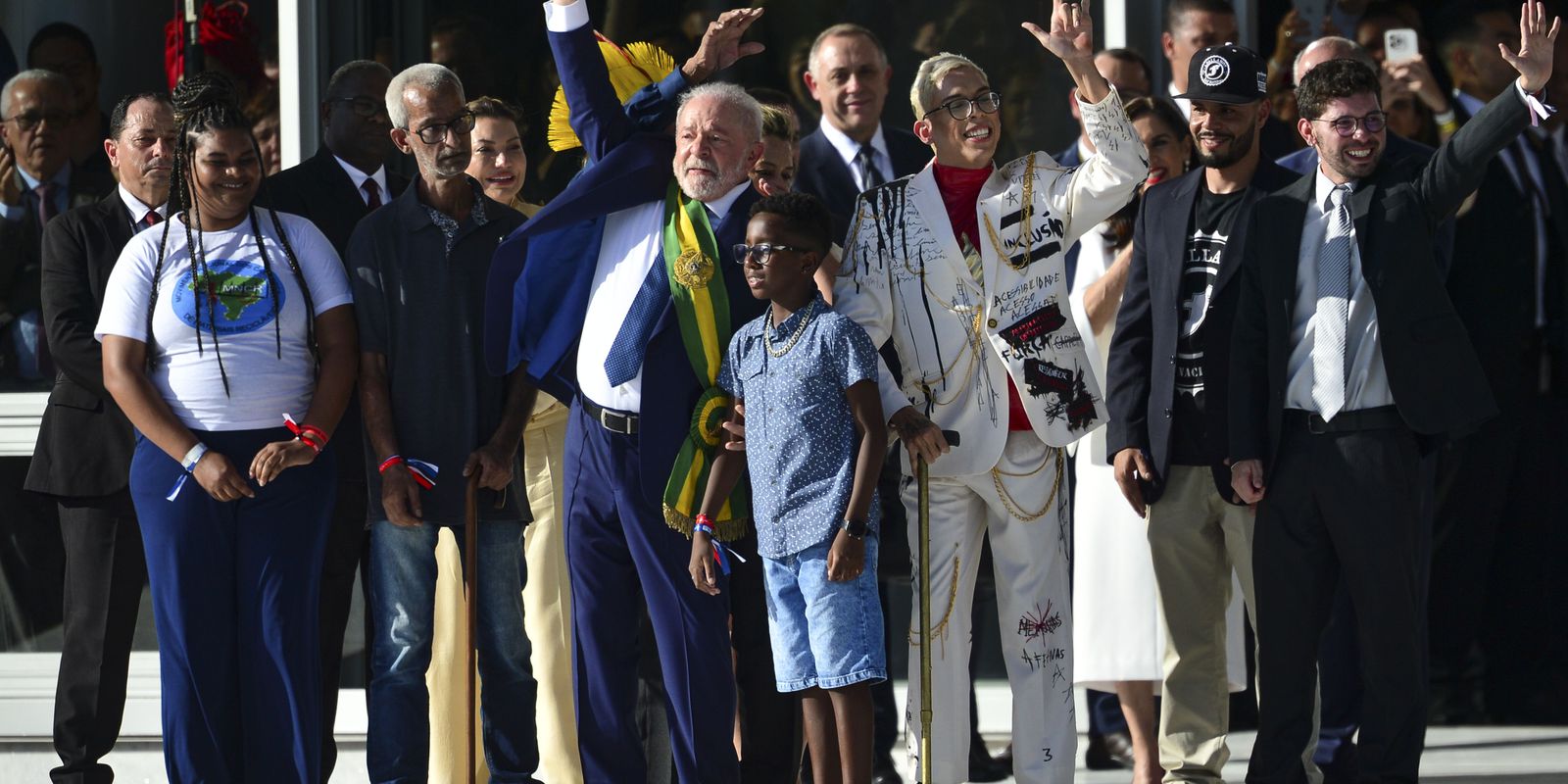 A equipe organizadora da posse, liderada pela primeira-dama Janja da Silva, optou por um ato carregado de simbolismo. Um grupo oito de pessoas representativas da sociedade brasileira subiu a rampa ao lado do presidente Lula e do vice-presidente Geraldo Alckmin. No alto da rampa, a faixa presidencial passou de mão em mão até ser entregue a Lula por uma mulher negra catadora de materiais recicláveis. No grupo, havia ainda uma criança negra, uma pessoa com deficiência, o cacique Raoni, líder indígena reconhecido internacionalmente, e pessoas que participaram da vigília permanente durante os 580 dias que Lula permaneceu preso em Curitiba, entre 2018 e 2019.