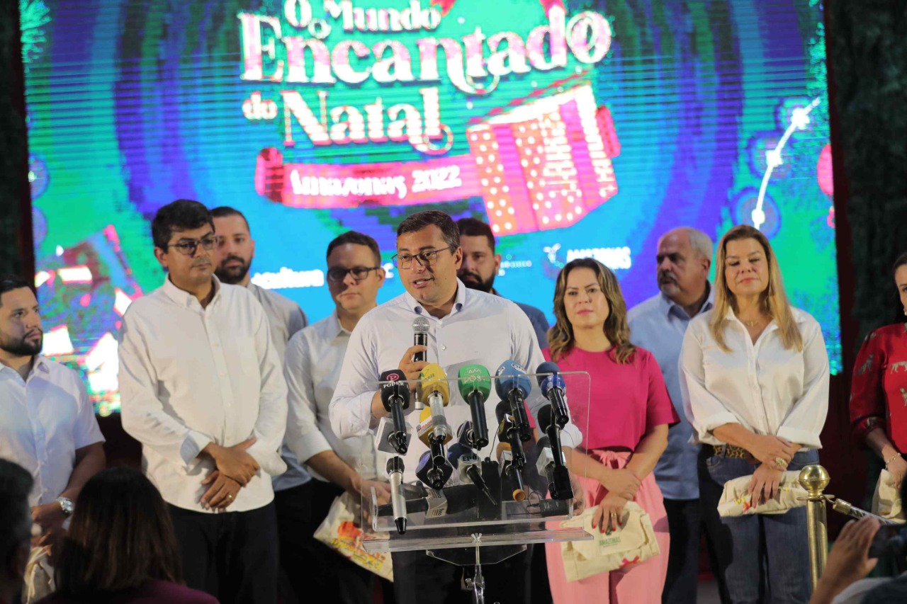 O governador Wilson Lima lançou na manhã desta sexta-feira (18/11) a programação natalina “O Mundo Encantado do Natal”, realizada pelo Governo do Amazonas, que terá um forte apelo econômico e social, segundo o chefe do Executivo Estadual. No planejamento estão o tradicional concerto no Teatro Amazonas, a aguardada decoração no Largo de São Sebastião, espetáculos e atividades culturais na capital e no interior, além de arrecadação de brinquedos, que serão doados a crianças em vulnerabilidade.